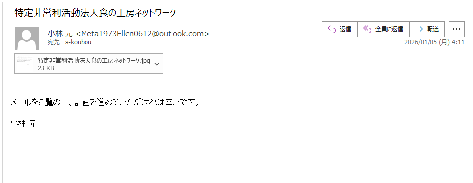 1月7日現在、正善寺工房以外にも同じ内容のメールが確認されております。